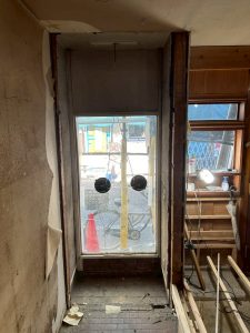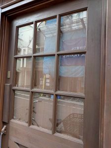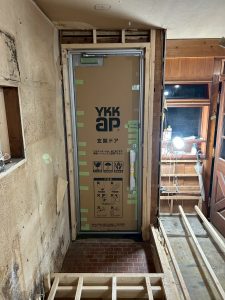 右側ウィンドウだったところのガラスを撤去し、新しく玄関ドアを設置しました。
