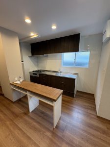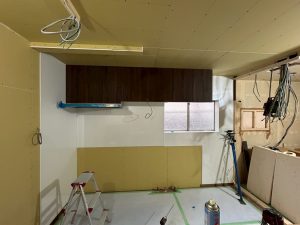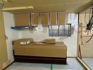 キッチンパネルを貼り、吊戸棚とキッチン本体を✨