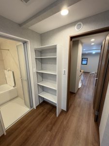 後ろには、タオル等の収納に便利な可動棚を作成しました🍀